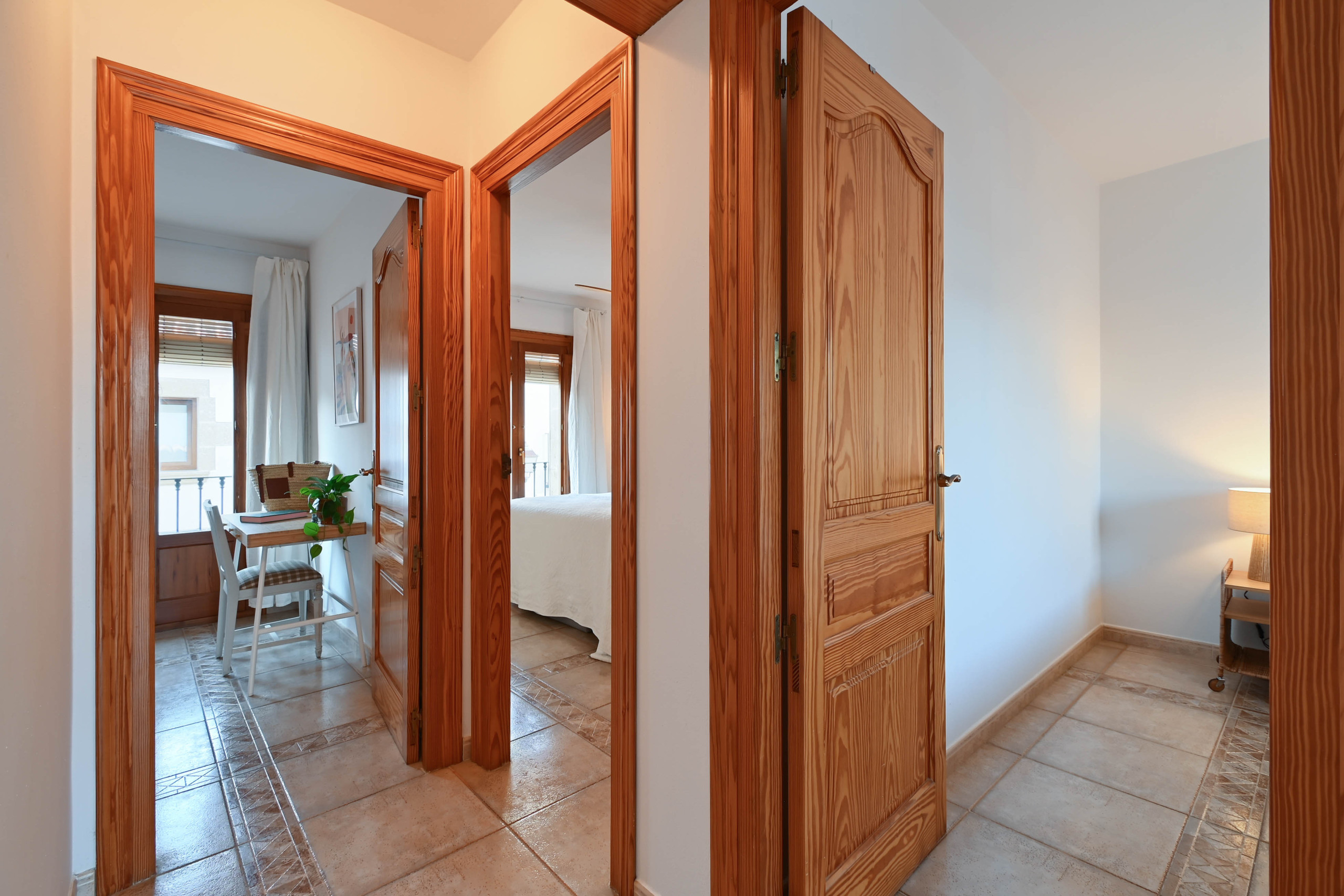 À l’étage supérieur se trouvent les chambres, conçues pour le repos et le confort. La chambre principale dispose d’un lit King Size et de la climatisation. Elle est accompagnée d’une deuxième chambre avec un lit Queen Size et un petit balcon, idéal pour se réveiller avec vue sur le centre historique. La troisième chambre, également équipée d’un lit Queen Size et d’un balcon, comprend un bureau pratique, parfait pour ceux qui souhaitent un coin tranquille pour lire ou travailler. La maison est complétée par une deuxième salle de bain avec baignoire et une terrasse privée équipée de transats, pensée pour profiter du soleil méditerranéen.